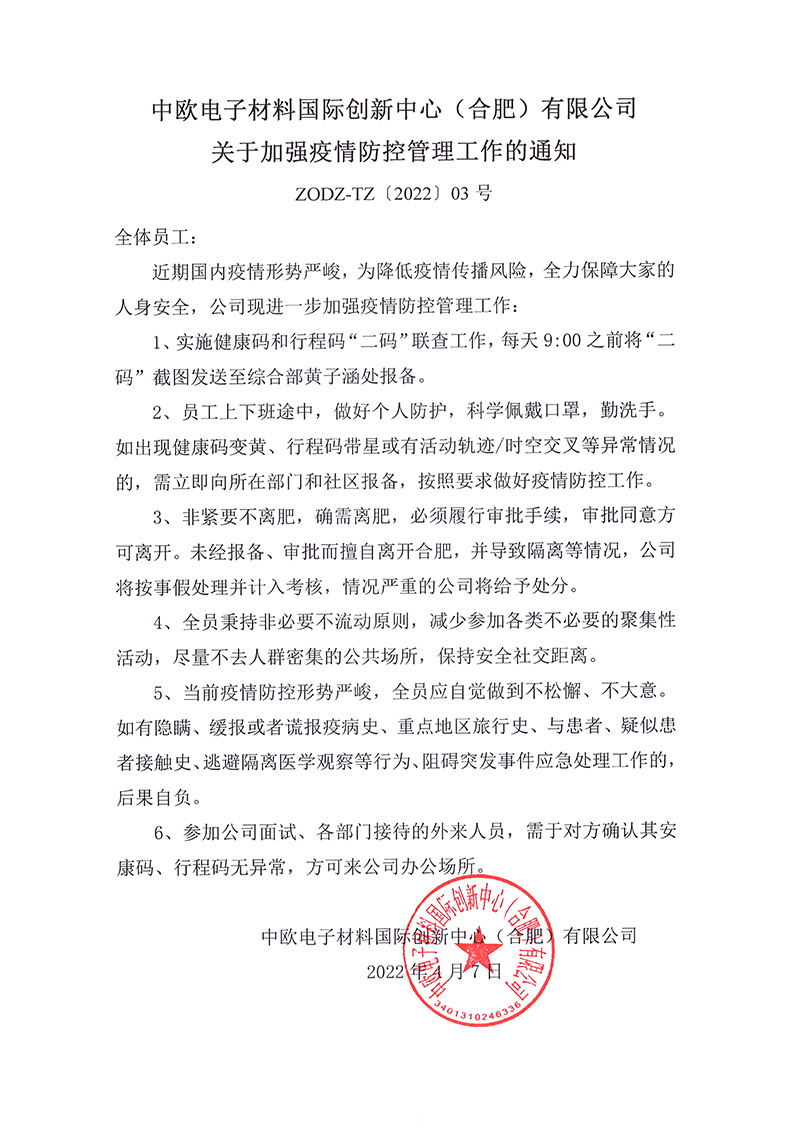 开云游戏平台(合肥)有限公司关于加强疫情防控管理工作的通知