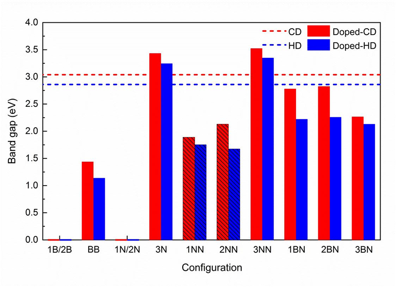 图3. 不同掺杂构型的带隙。单色的柱状表示直接带隙,有斜线的柱状表示间接带隙。红色虚线和蓝色虚线分别表示纯的立方金刚石烯和六方金刚石烯的带隙