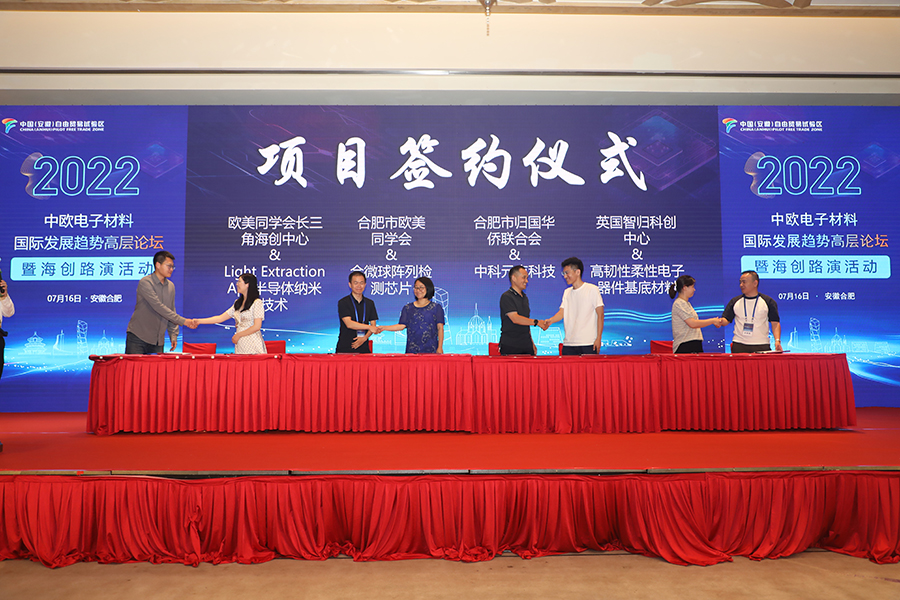 论坛同期举办了“智归长三角 科创聚英才”海创路演活动。合肥高新区党工委委员、管委会副主任罗敏致辞;合肥高新区国际人才交流服务中心副主任李靖伟介绍了产业人才政策;中安创谷科技园副总经理蔡昊宣传推介安徽省创响中国创业创新大赛情况。固体所副研究员刘迪龙、挪威科技大学博士卓毅智、Light Extraction ApS联合发起人Stanley Lim、中科元贞技术负责人分别介绍了四个电子材料类路演项目,并于会后进行项目签约仪式。“同时,聚焦青年英才 发展电子材料”师生学术论坛分会场上,来自固体所和安徽大学的师生交流了有关新材料的最新研究进展。