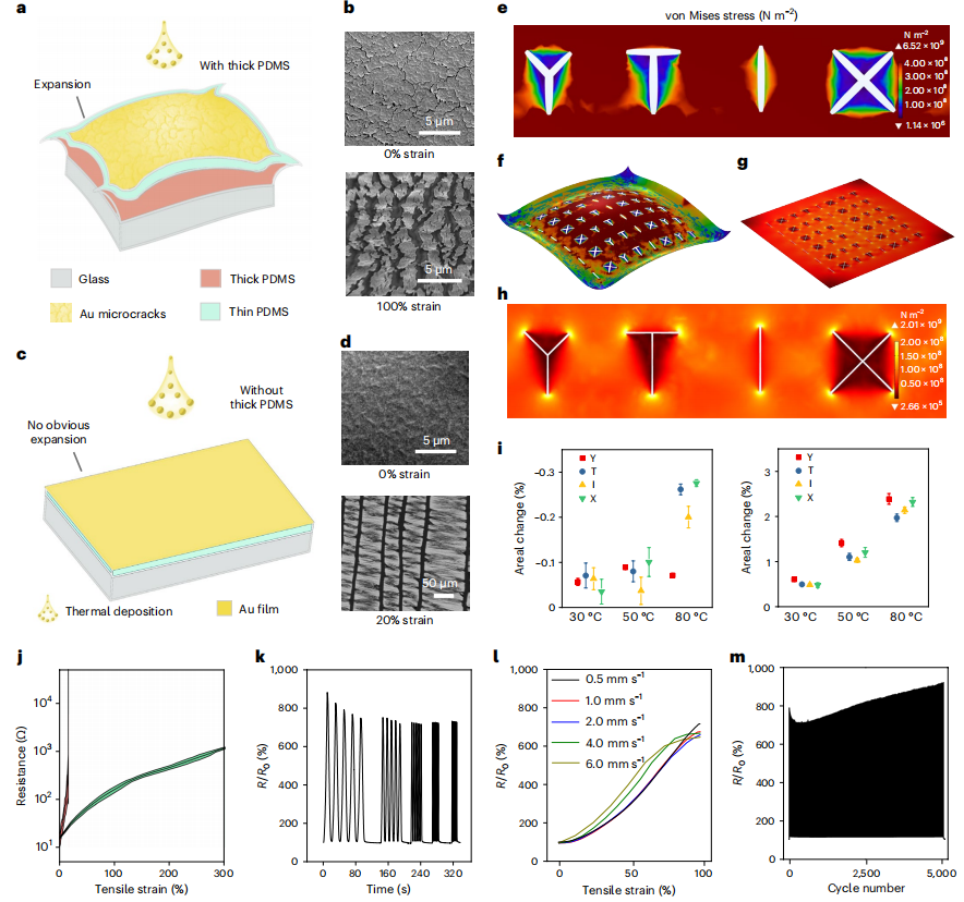 为了获得微米厚的PDMS-Au电极的Au层的微裂纹形态,因此在热蒸发镀金过程中,玻璃基板和微米厚的PDMS之间加了一层100µm厚的PDMS层。在热蒸发镀金的过程中,厚PDMS薄膜的热膨胀导致蒸发的金在超薄PDMS上形成微裂纹结构。这种微裂纹架构呈现三分支形状均匀分布在Au层中,这对在拉伸状态下保持导电性至关重要。相比之下,在没有厚PDMS膜的微米厚的PDMS薄膜玻璃上直接形成Au层,几乎没有可见的微裂纹,只有微小的褶皱。因此在没有制备过程中没有加厚PDMS层的情况下,超薄PDMS-Au在17%的拉伸应变内失去了电导率,因为在垂直于拉伸方向的拉伸过程中形成了长长的平行裂纹,这些Au碎片之间没有任何连接。相应的COMSOL模拟优化了厚度对微裂纹形成的条件,证明了由于热应力较大,高温会导致裂纹的形成,但如果温度过高,可能会降低PDMS膜本身的力学性能。