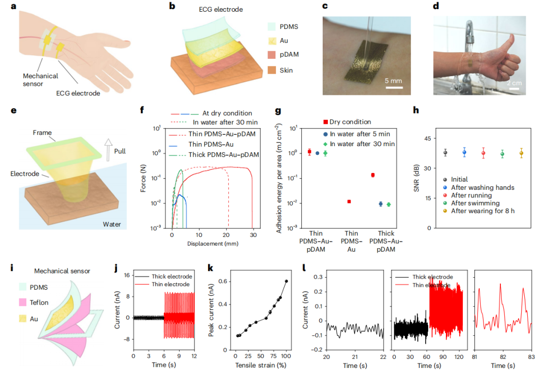 为保证表皮传感器的贴合,在PDMS-Au薄膜与皮肤接触的地方加一层22nm厚的离子导电聚合物层(pDAM)。电极和粘接聚合物的结合,使得电极在皮肤变形和水冲洗情况下保持附着在皮肤上。此外,薄薄的pDAM层不影响电极的气体渗透性,适合长期使用情况下不造成皮肤问题。超薄的PDMS-Au-pDAM电极能够在志愿者进行跑步、游泳等剧烈运动后和洗手过程中,连续8 h记录心电图信号。其信噪比值稳定在37.5 dB,保证了日常生活中生物信号的持续监测不受干扰。