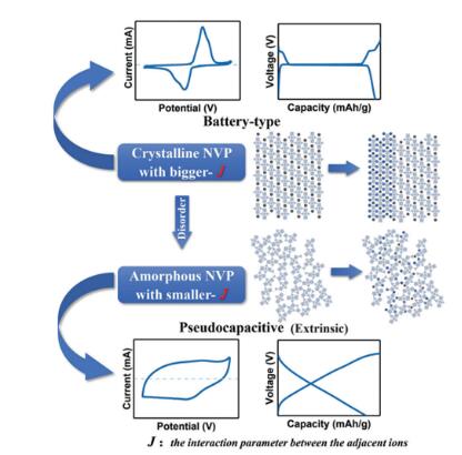 基于此,科研人员通过调控材料结晶度的方案来对Na3V2(PO4)3材料进行改性研究,利用静电喷雾沉积法在泡沫碳衬底上制备了一种纳米晶和无定形相共存的Na3V2(PO4)3材料。研究结果表明,这种纳米晶和无定形相共存的无序结构可以有效激活M1位点的钠离子,使V5+/V4+氧化还原对参与到电化学反应过程中,在Na3V2(PO4)3 中实现三个钠离子的可逆嵌入脱出,极大提升了材料的比容量。在 0.2 C 的电流密度下,所获材料的比容量可达179.6 mAh g-1,比通常Na3V2(PO4)3材料提升了近50%。同时,该材料在0.2 C倍率下循环 200 圈,容量保持率高达 99.6%,兼顾了大容量与稳定循环的优点。此外,在这种纳米晶和无定形相共存的Na3V2(PO4)3材料中,研究人员还观察到一种较为奇特的非本征赝电容现象,表现为充放电曲线中平台的消失和CV曲线的矩形化,这主要是由于无序结构的引入改变了Na3V2(PO4)3材料中钠离子之间的相互作用,使得充放电过程由原本的两相转变变为单相转变。