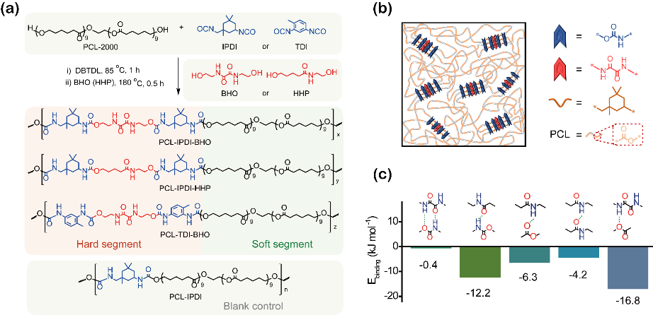 近日,西安交通大学张彦峰团队设计了一种基于分层氢键相互作用的可生物降解聚氨酯弹性体。作者利用聚己内酯(PCL)、二异氰酸酯和 N,N-双(2-羟乙基)乙酰胺(BHO)作为原料,通过无溶剂聚合的方法快速制备了这种无色透明的弹性体,其中丰富的氢键相互作用阻碍了PCL段的结晶,促进了在弹性体内部形成均匀分布的硬相微域,奇迹般地实现了极高的强度和韧性以及前所未有的高断裂能,加之良好的生物相容性和降解性,可通过3D打印技术制成疝气补片应用于生物医学。此外,就机械性能而言,该弹性体在国防工业、柔性电子、缓冲吸能等方面同样具有很大的应用潜力。