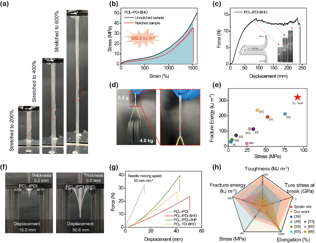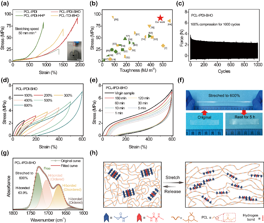 在这项工作中,PCL-IPDI-BHO弹性体的断裂强度为92.2 MPa,同时保持了约1900%的断裂伸长率和480.2 MJ m-3的超高韧性,其真实应力高达1.9 GPa。同时,PCL-IPDI-HHP弹性体表现出良好的回弹性,这是因为其结构的刚度较低、链段的流动性较高,因而弹性范围相对较宽。此外,作者通过FT-IR光谱分析发现在拉伸过程中酰胺键和酯键重组了氢键且缔合氢键占比较高,这可能是弹性体中较大能量耗散的重要因素之一。