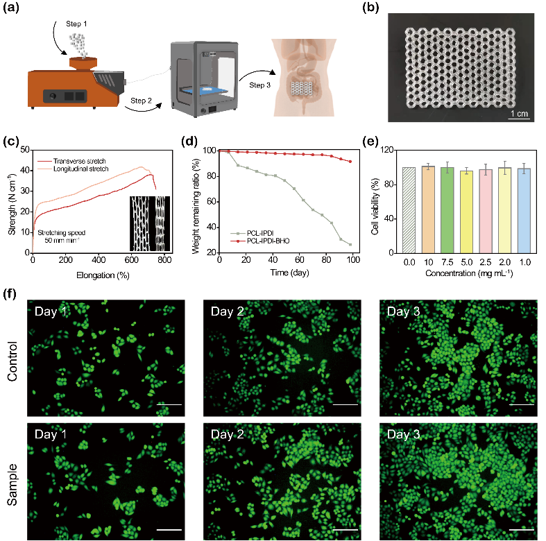 最后,作者通过3D打印将PCL-IPDI-BHO弹性体加工成疝气补片用于生物医用。该补片继承了弹性体优异的机械性能,且其优异的生物相容性和在一段时间内保持稳定后缓慢降解的特点与临床需求吻合,可作为理想的疝气补片材料用于体内生物应用。