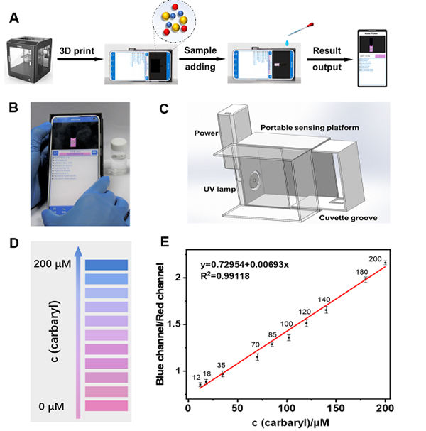 为此,研究人员利用氨基修饰的金纳米颗粒、硅量子点和碲化镉量子点作为传感中心,设计了一种双模态(比色-比率荧光)传感体系,能够可视化定量检测痕量西维因残留。当西维因进入传感体系后,会通过静电效应触发金纳米颗粒团聚,导致紫外可见吸收光谱变化,伴随着肉眼可观察到的自然光下的溶液颜色变化。同时,金纳米颗粒的团聚引发荧光共振能量转移(FRET)效应,硅量子点的蓝色荧光发射强度逐渐增加,而碲化镉量子点的红色荧光强度显著降低,从而导致体系荧光颜色由红到蓝的显著转换。 研究发现,双模态传感体系具有更高的检测灵敏度与准确性,比色模式下检测限为49.6 nM,比率荧光模式下检测限为16.3 nM,实现了对实际样品中痕量西维因残留的高灵敏度、即时可视化检测。此外,结合3D打印技术与颜色识别应用(APP),研究团队还构建了具有高兼容性的便携式智能荧光检测平台,以扩展其实际应用。该工作为氨基甲酸酯类农药残留检测提供新策略,并拓宽了便携式可视化定量检测装置在化学传感中的应用。 上述研究工作得到了国家自然科学基金项目、国家重点研发计划以及安徽省重点研究与开发计划项目的支持。