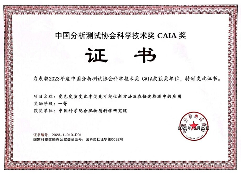 近日,中国分析测试协会公布了2023年度“中国分析测试协会科学技术奖(CAIA奖)”获奖名单,中国科学院合肥物质科学研究院固体物理研究所能源材料与器件研究部与军事科学院军事医学研究院合作的研究成果“宽色度演变比率荧光可视化新方法及在快速检测中的应用”项目荣获一等奖。固体所蒋长龙研究员为第一完成人,杨亮、林丹、徐诗皓为主要完成人。