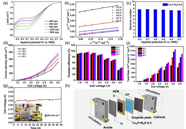 图1. Cu3P-Ni2P-0.5(a)不同转速下LSV曲线,(b)Koutécky-Levich(K-L)曲线和(c)转移电子数;不同温度下(d)膜电极电解槽电压与电流之间的关系图,(e)氨法拉第效率和(f)氨产率,(g)耐久性测试,(h)膜电极电解槽装置示意图。