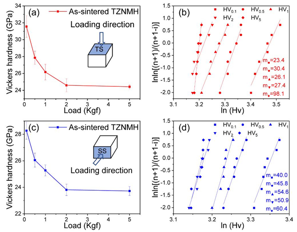 图3. 高熵硼化物陶瓷在不同载荷条件下的维氏硬度及Weibull分布:(a)、(b) 顶面;(c)、(d) 侧面。
