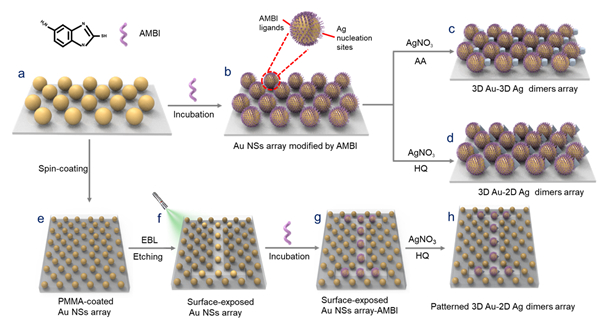 图1. Au-Ag二聚体阵列的制备流程图:(a) Au NSs阵列;(b) AMBI配体修饰改性后的Au NSs阵列;(c) 抗坏血酸作为还原剂获得3D Au-3D Ag二聚体阵列的示意图;(d) 对苯二酚作为还原剂获得3D Au-2D Ag二聚体阵列的示意图;(e) 表面旋涂PMMA光刻胶的Au NSs阵列;(f) 通过电子束光刻技术获得的图案化Au NSs阵列;(g) AMBI配体修饰改性后的图案化Au NSs阵列;(h) 图案化Au-Ag二聚体阵列。