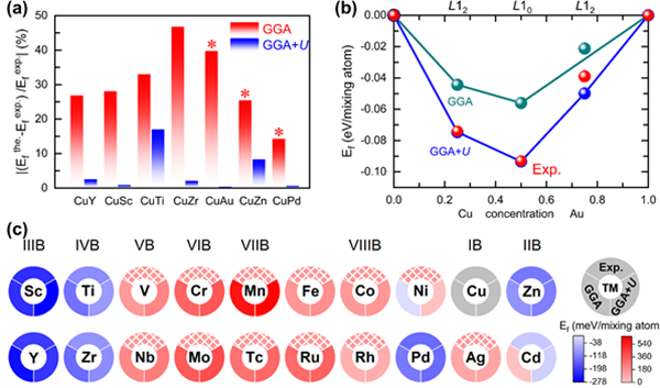 图. (a) 理论预测的形成能与实验测量值之间的差异。其中红色和蓝色条带分别表示GGA和GGA+U 预测的结果;(b) 使用GGA(绿色小球与线条)和GGA+U (蓝色小球与线条)预测的Cu-Au体系的能量基态线。红色小球表示320 K温度下的实验测量值;(c) GGA和GGA+U 计算的19种Cu-TM化合物的形成能。顶部被实色填充的饼图代表了实验测量的有序合金的形成能,而被网格填充的饼图则表明其相应的过渡金属无法与铜形成有序结构。