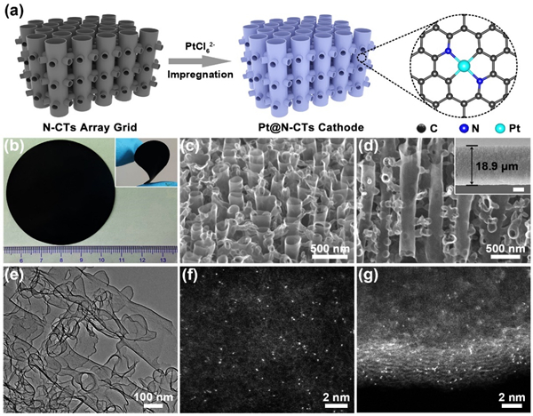 图1. 3D Pt@N-CTs网格薄膜电极的制备流程和形貌表征:(a)制备流程示意图;(b)光学图片(插图:可弯曲的自支撑电极);(c,d)SEM图;(e)低分辨TEM图;(f,g)球差校正的高角环形暗场扫描透射图。