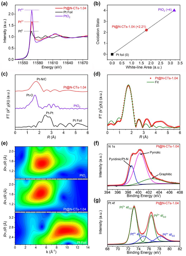 图2. 3D Pt@N-CTs的配位结构表征:(a)同步辐射测试的Pt L3-edge XANES光谱;(b)拟合的Pt-SAs价态;(c)R空间K2-weighted FT-EXAFS;(d)R空间拟合图;(e)小波变换分析;(f)N 1s的XPS谱图;(g)Pt 4f的XPS谱图。