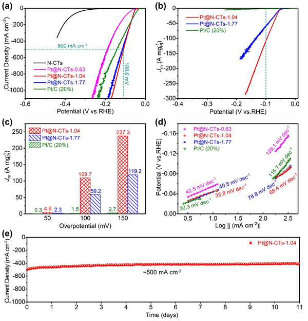 图3. HER性能测试结果:(a)线性扫描伏安曲线;(b)质量活性曲线;(c)不同过电势下的质量活性对比图;(d)Tafel斜率;(e)稳定性测试。