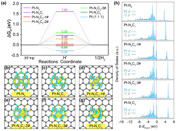 图4. 密度泛函理论(DFT)计算结果:(a)DFT计算优化后获得的Pt-NxC4-x(x=1-4)配位结构的氢吸附自由能;(b-g)对应的差分电荷密度;(h)态密度图。