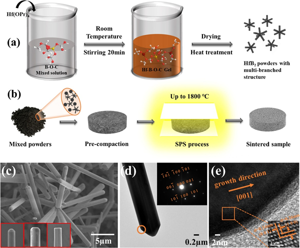 图1. 多分支状HfB2粉体的合成示意图(a)和HfB2粉体的烧结过程(b);(c) 多支状HfB2的SEM图像;(d-e) HfB2棒状分支的TEM表征。图(c)中的插图是1500 ℃下HfB2微棒尖端的演变行为。