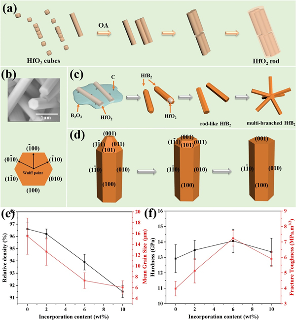 图2. (a) 立方状HfO2在OA过程下转化为棒状HfO2的生长过程示意图;(b) HfB2分支末端的SEM图像和沿c方向观察HfB2晶体的Wulff结构;HfB2微棒的形成过程(c)和其尖端的微观结构演变(d)示意图;HfB2微棒添加量对样品相对密度和晶粒尺寸(e),硬度和断裂韧性(f)的影响。