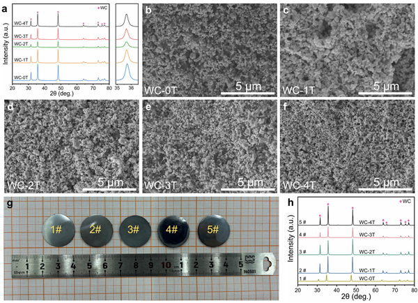 图1. 不同 TaC 掺杂含量对 WC 物相及微观形貌的影响 (a) XRD 图谱,(b-f) SEM 图像,(g) 不同 TaC 掺杂量的 WC 陶瓷块体的光学图像,(h) 热压烧结后陶瓷块体的 XRD 图谱。