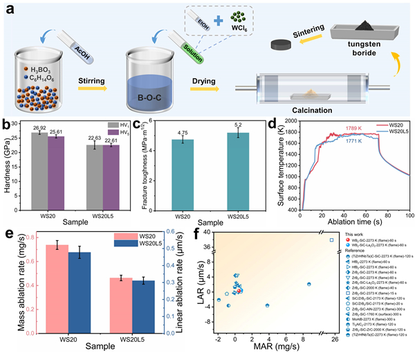 图2. (a) WB2 粉体的制备流程图;(b-c) WS20 和 WS20L5 的硬度与断裂韧性;(d) WS20 和 WS20L5 在烧蚀试验过程中的表面温度曲线;(e) WS20 和 WS20L5 的质量烧蚀率和线消融率;(f) WS20 和 WS20L5 的抗烧蚀性能与其他 UHTCs 的对照。