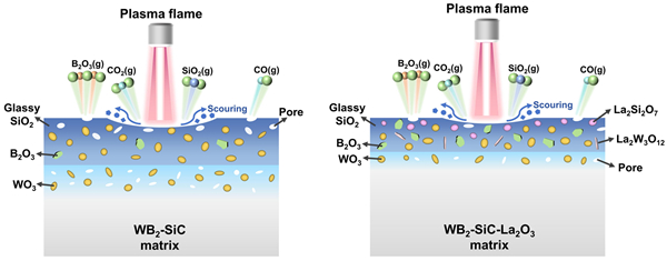 为了进一步提升硼化钨基陶瓷的抗氧化烧蚀性能,研究人员提出采用 La2O3 稳定 WS20 复材。La2O3 的加入显著提高了 WS20 复合材料的断裂韧性和抗烧蚀性能。在 2273 K 等离子火焰烧蚀 60 s 的条件下,WB2-SiC-La2O3(WS20L5)复合材料的质量烧蚀率和线烧蚀率分别为 0.463 mg/s 和 0.311 μm/s,与多数已报道的锆、铪基等超高温陶瓷的抗烧蚀性能相当。微结构分析表明,这种性能的提升主要归因于 La2O3 与 SiO2 在高温下反应生成的 La2Si2O7 对 B2O3 具有钉扎作用,能够有效抑制 B2O3 的挥发;且高温下 La2O3 固溶在 B2O3 和 SiO2 玻璃相中形成的高粘度 B-Si-O-La 保护层在填充了孔隙的同时还能够阻隔氧气的侵入。