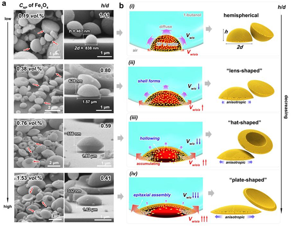 图1. (a) 瞬态乳液气溶胶体系构建及自组装示意图;(b-f)半球形超结构形貌表征。