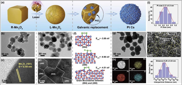 为增强 Pt 纳米颗粒的光收集能力,研究人员设计了胶体球(Colloidosomes ,Cs)结构,借助金属颗粒间的光子散射,提升其从可见光到近红外波段的光吸收效率。同时,将 Pt 纳米颗粒嵌入金属氧化物介电基质中,促进吸收介电表面散射的光子。研究发现,Pt 离子与 Mn3O4 表面发生电化学置换反应,会形成多孔的 Pt/Mn3O4 纳米复合材料,其中 Mn3O4 作为牺牲剂,形成了负载超小 Pt 纳米颗粒的多孔骨架。理想情况下,这种纳米结构可转化为 Pt 金属胶体球,通过精准控制 Mn3O4 的消耗量,有望形成一层紧密排列的 Pt 纳米颗粒外壳,且保留多孔结构和粗糙金属表面内部的多重光散射特性。然而,目前实验上还尚未成功制备出均匀且紧密排列(颗粒间距小于1 nm)超小 Pt 纳米颗粒层的 Pt胶体球(Pt Cs)。