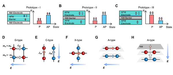 图1. (A-C) 反铁磁隧道结的三种基本类型;(D-G) 不同反铁磁结构允许的自旋极化输运特性(体效应);(H) A型反铁磁体未补偿的界面磁矩支持具有宏观自旋极化的隧穿电流。