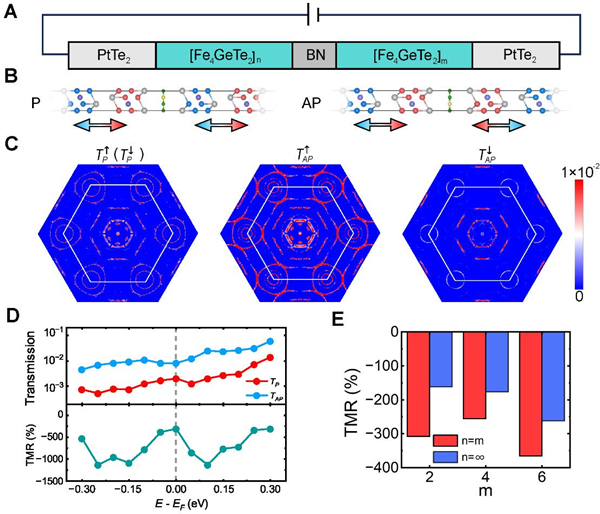 基于这一新机制,研究团队提出了第三类反铁磁隧道结的设计原则——通过界面效应而非体效应实现高效的自旋输运(图1(C))。研究人员构建了以二维范德华A型反铁磁金属Fe₄GeTe₂为电极、非磁绝缘体BN为势垒的隧道结模型。量子输运模拟结果显示,即便电极材料本身具有自旋简并的能带结构,其界面仍能产生显著的自旋极化电流(图2)。更重要的是,该效应不受电极厚度或层数奇偶性影响,进一步证实其源于界面机制。