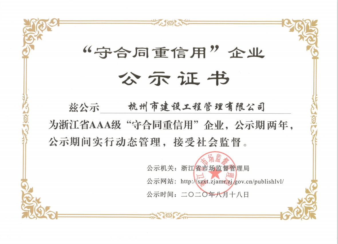 开云游戏平台建设工程管理有限公司荣获2020年浙江省AAA级“守合同重信用”公示证书,不仅证实了杭建“不信不立,不诚不行”一诺千金的企业行为,而且证明了杭建人在砥砺前行的道路上工作井然有序与有条不紊,我们将坚持以严谨的工作态度、实事求是、科学公正的立场,致力于招标代理和造价咨询事业。公司全体员工衷心感谢广大新老客户对公司发展的支持和帮助!